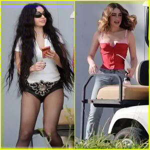 For their time on set, Charli wore a white T-shirt, black bootie shorts, leggings, a big bedazzled belt, and sunglasses while Rachel wore a red corset over a pink bra paired with jeans.